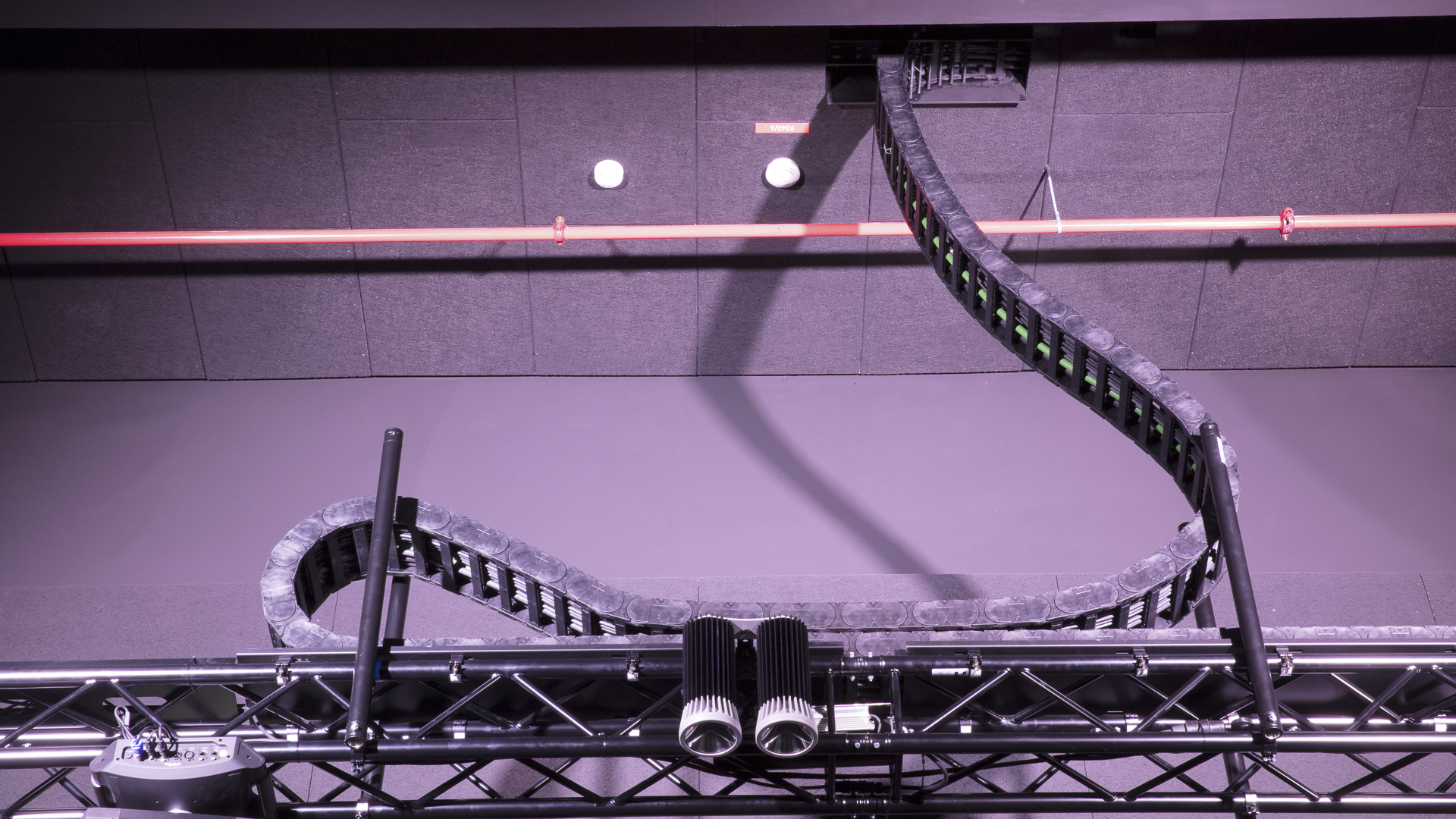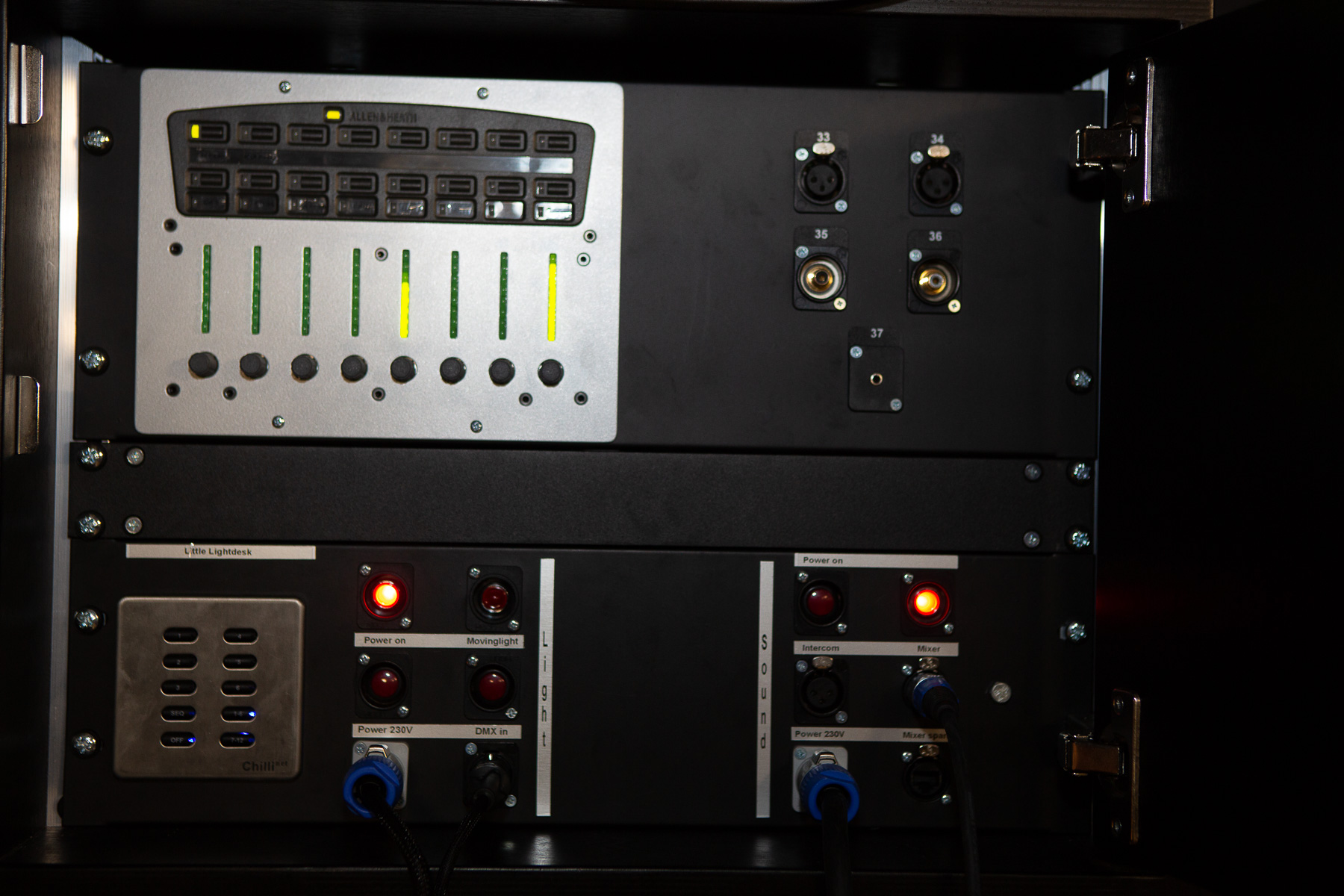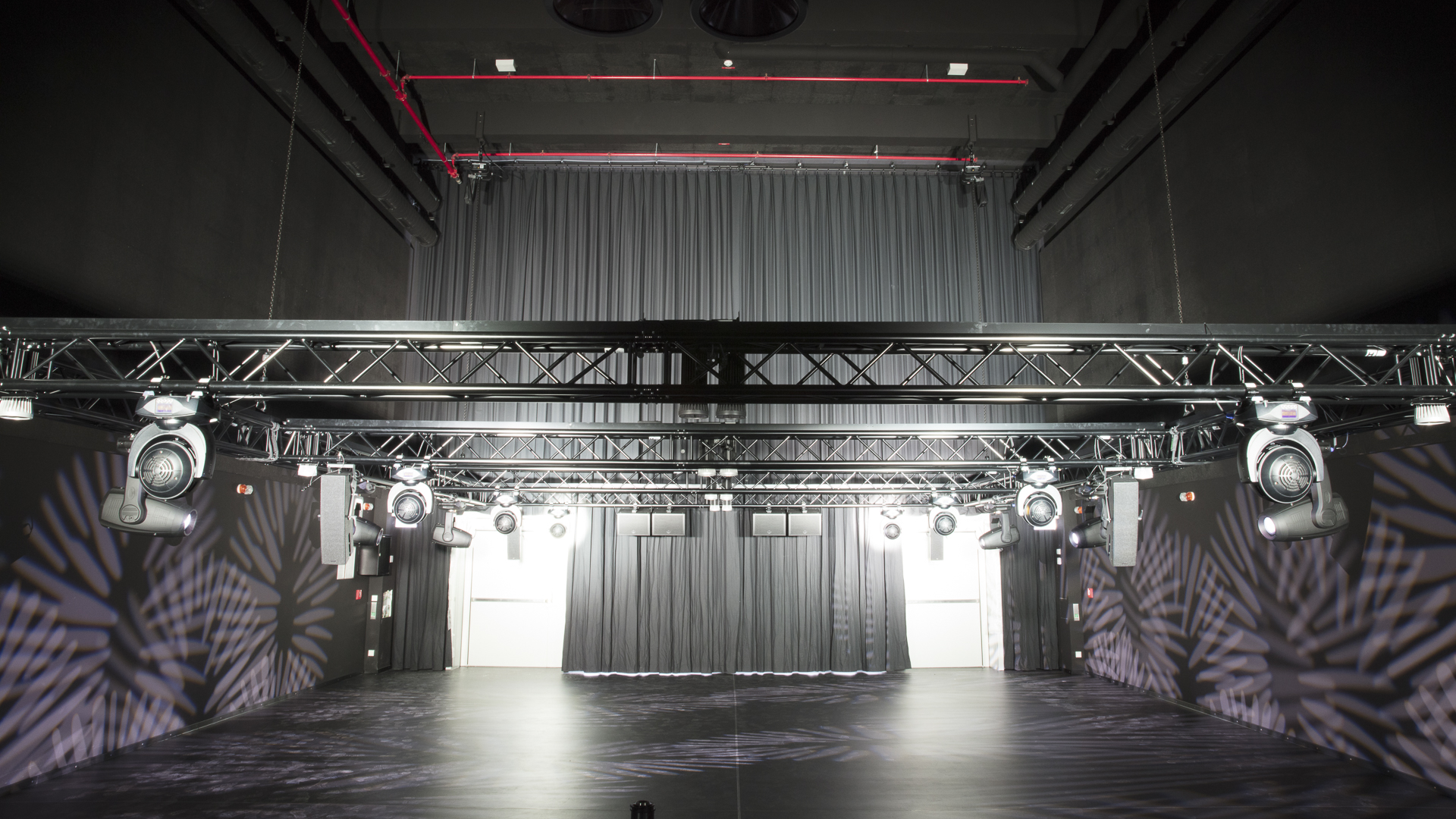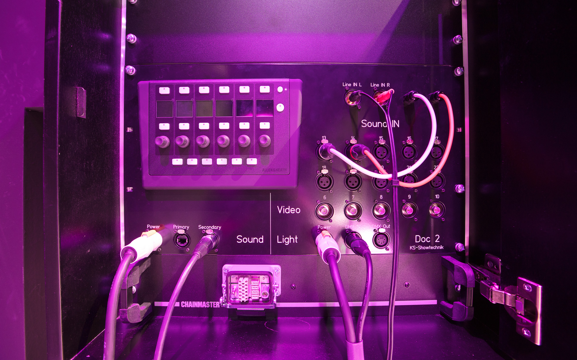 Gemeinsam mit Hochtief haben wir einen Veranstaltungsraum nach dem Black-Box-Prinzip entwickelt und realisiert. Die Idee dahinter ist, dass der Raum sich in Architektur, Licht und Ton maximal verändern lässt. Ganz klassisch mit frontaler Bühne, oder mit Bühne mittig und Publikum drum herum, Publikum auf der Bühne und Künstler im Saal – das sind nur drei von vielen möglichen Nutzungsszenarien. Erreicht haben wir das mit elektrisch fahrbaren Traversen und kopfbewegten LEDs (Moving Lights) von Elation sowie JB Lightning. Dank ihrer Blendenschieber lässt sich die Beleuchtungsform flexibel anpassen. Wash-Lights tragen zur Farbenpracht bei. Für den Ton haben wir mit dem Allen Heath C-Live top-aktuelle Mischpulttechnik mit bewährten Lautsprechern von Seeburg kombiniert. Alle Lautsprecher sind aufgehängt, inklusive den Bassboxen. Die Leitungsführung ist durch ein Schleppkettensystem realisiert. Dadurch hängen keine Leitungen lose herum, sondern alles ist ordentlich und sicher verstaut.