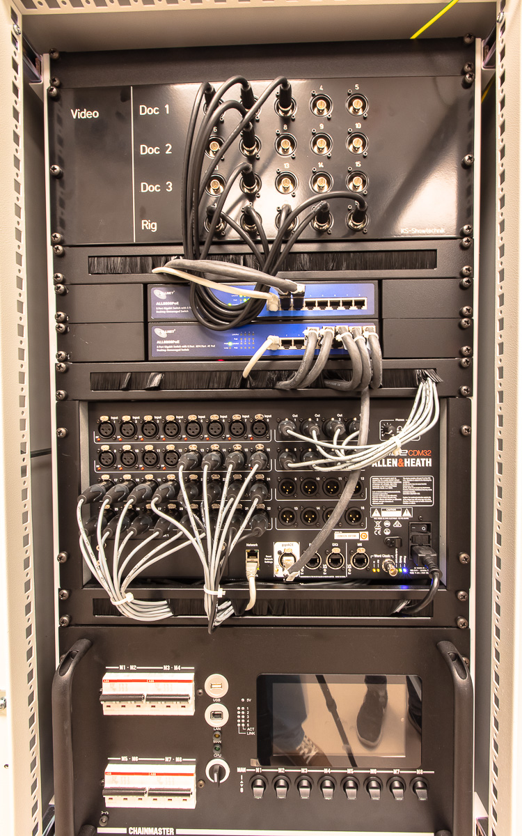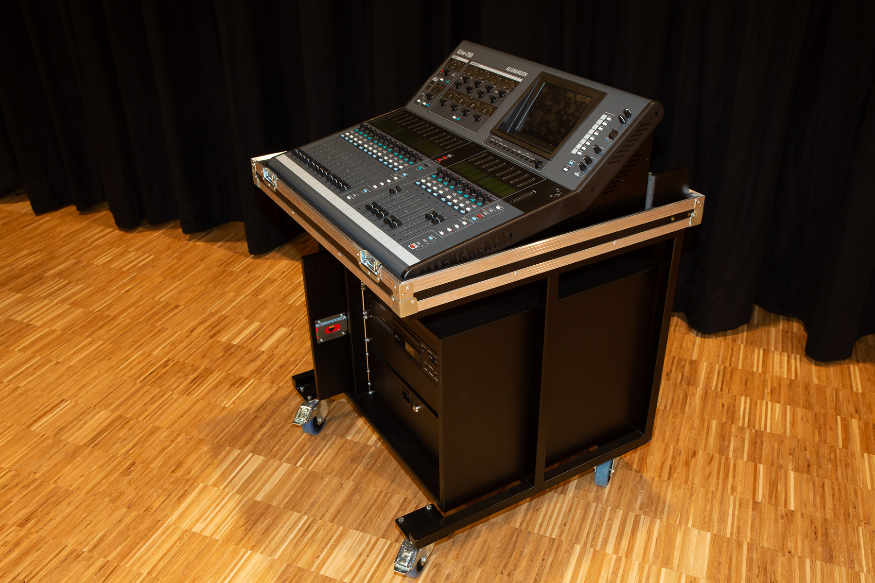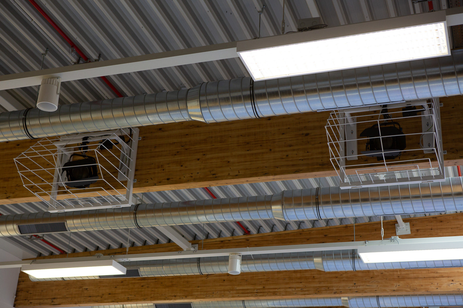 Gemeinsam mit Hochtief haben wir einen Veranstaltungsraum nach dem Black-Box-Prinzip entwickelt und realisiert. Die Idee dahinter ist, dass der Raum sich in Architektur, Licht und Ton maximal verändern lässt. Ganz klassisch mit frontaler Bühne, oder mit Bühne mittig und Publikum drum herum, Publikum auf der Bühne und Künstler im Saal – das sind nur drei von vielen möglichen Nutzungsszenarien. Erreicht haben wir das mit elektrisch fahrbaren Traversen und kopfbewegten LEDs (Moving Lights) von Elation sowie JB Lightning. Dank ihrer Blendenschieber lässt sich die Beleuchtungsform flexibel anpassen. Wash-Lights tragen zur Farbenpracht bei. Für den Ton haben wir mit dem Allen Heath C-Live top-aktuelle Mischpulttechnik mit bewährten Lautsprechern von Seeburg kombiniert. Alle Lautsprecher sind aufgehängt, inklusive den Bassboxen. Die Leitungsführung ist durch ein Schleppkettensystem realisiert. Dadurch hängen keine Leitungen lose herum, sondern alles ist ordentlich und sicher verstaut.