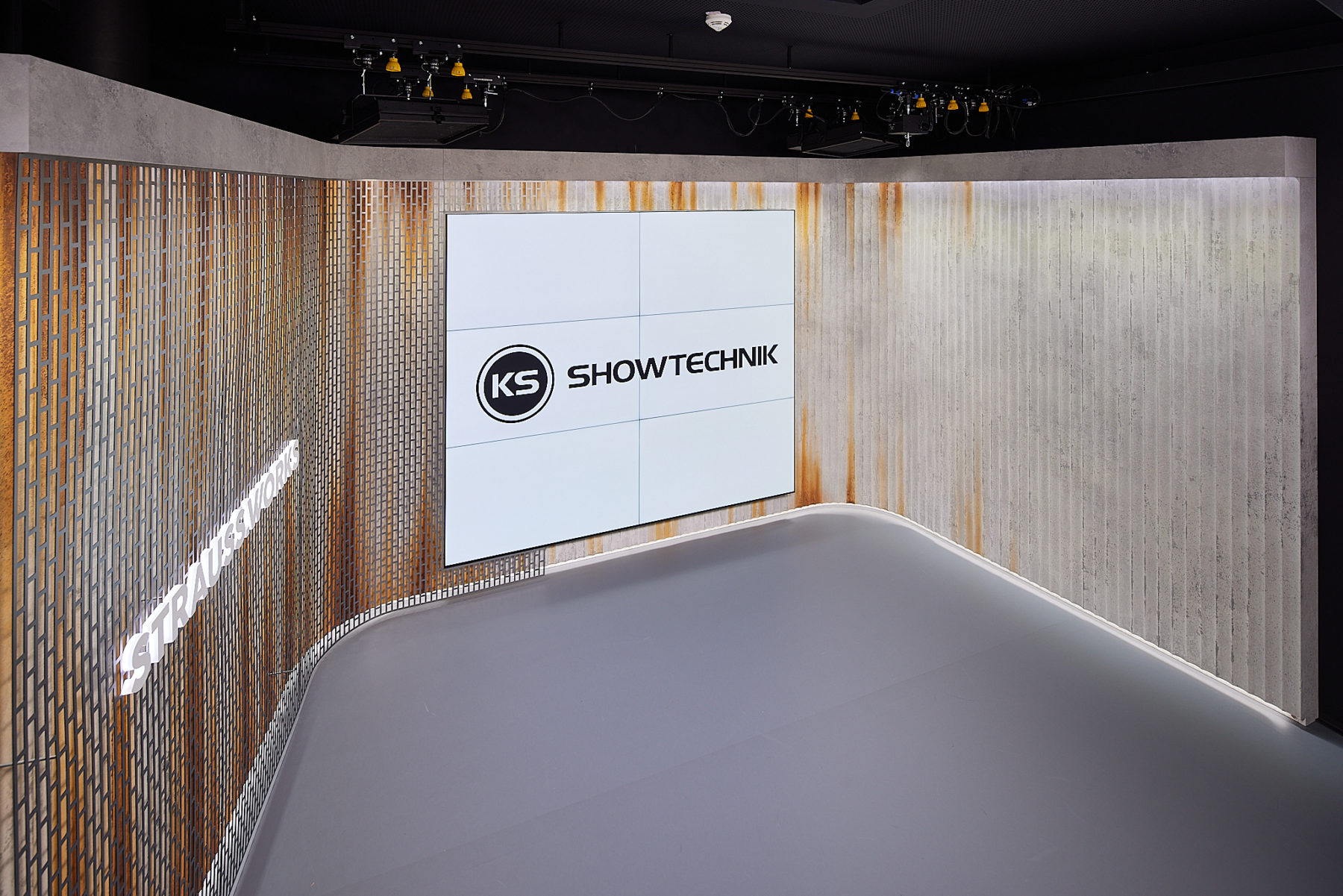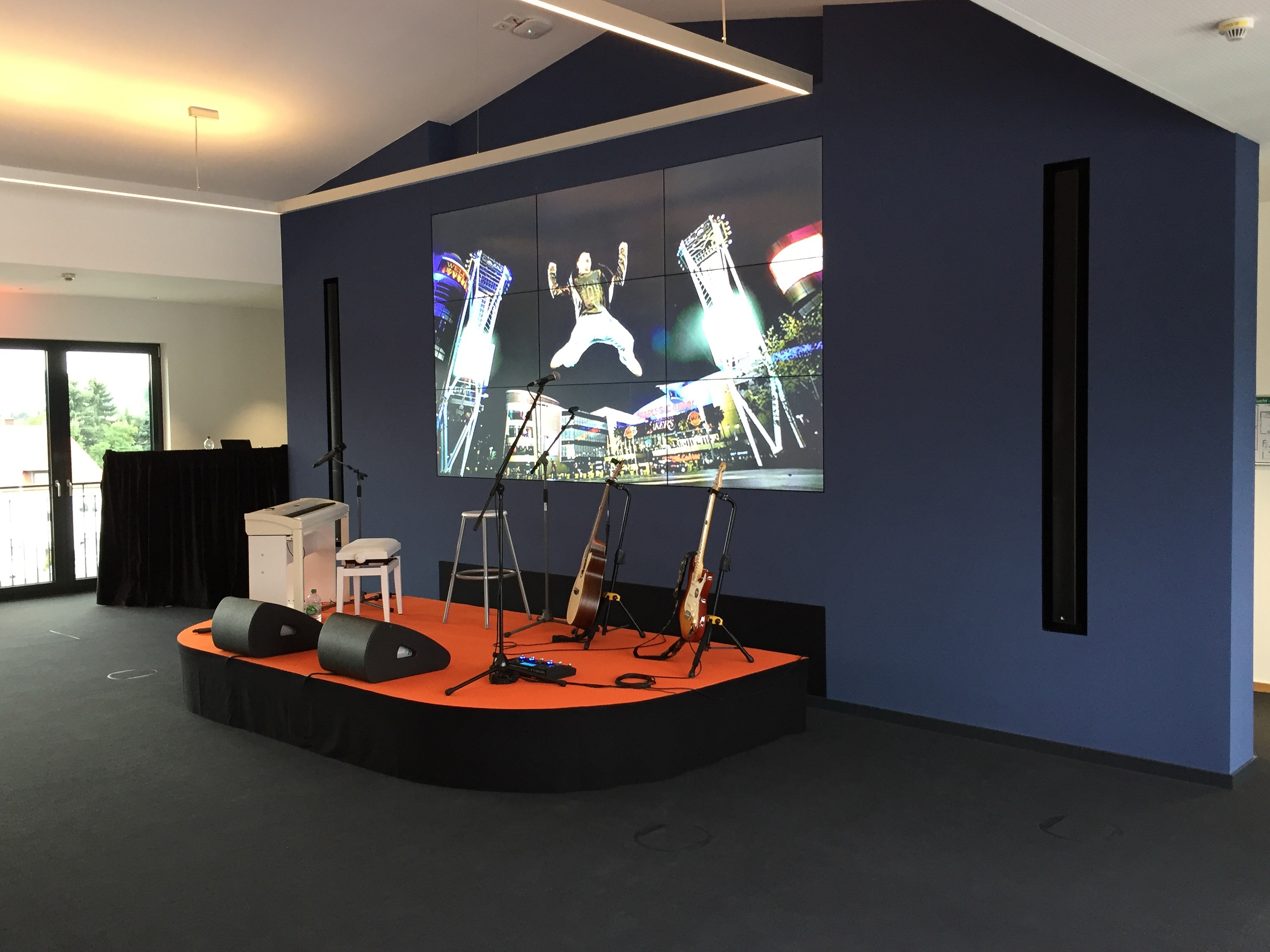 Auch in die als konservativ geltende Finanzwelt gehen wir mit kreativen Ideen. Bezogen auf die VR Bank Main Kinzig eG bedeutet das: Wir haben ein Konzept für den neuen Veranstaltungsraum und dessen geplante, vielfältige Nutzungsmöglichkeiten entwickelt. Heute wird er sowohl für interne Präsentationen und Mitarbeiterschulungen als auch für öffentliche Veranstaltungen und Empfänge genutzt. Immer mit dabei sind Medientechnik, Raumakustik und Beleuchtung von KS-Showtechnik. Ein guter Teil davon verschwindet unsichtbar in der von uns entwickelten Splitwand, zum Beispiel die großen Basslautsprecher. Bodentanks sorgen für eine elegante und flexible Verkabelung. Anderes soll gut sichtbar sein. Das gilt beispielsweise für die insgesamt neun 55-Zoll-Displays, die wir steglos aneinander gesetzt haben. Bei Bedarf lässt sich der Ton aus dem Veranstaltungsraum auch ins Foyer und den Außenbereich übertragen. Die gesamte Technik lässt sich bequem vom Touchpanel aus steuern, alternativ vom iPad aus. Sicherheitstechnisch haben wir dabei allen Belangen der Banken-IT Rechnung getragen.