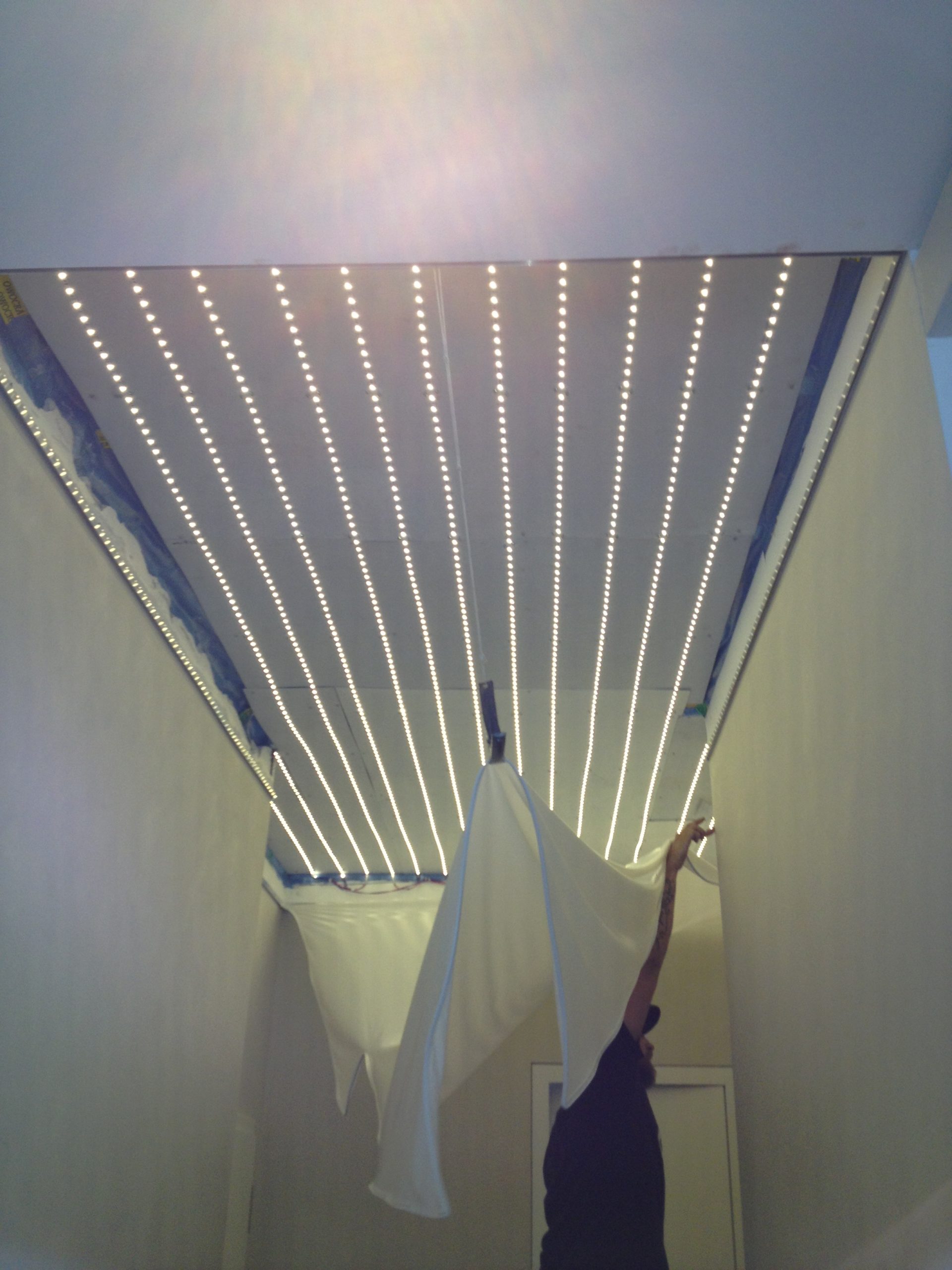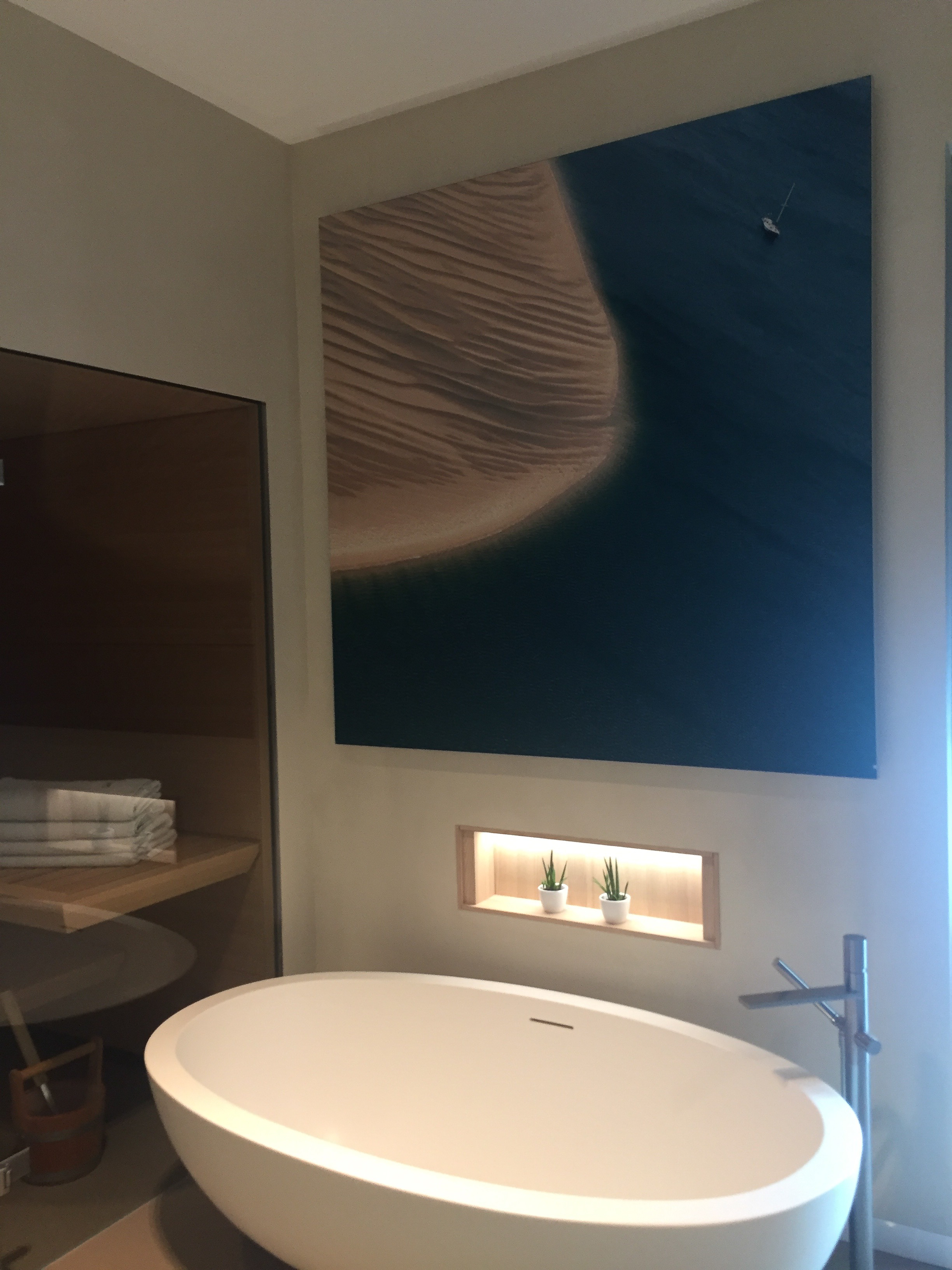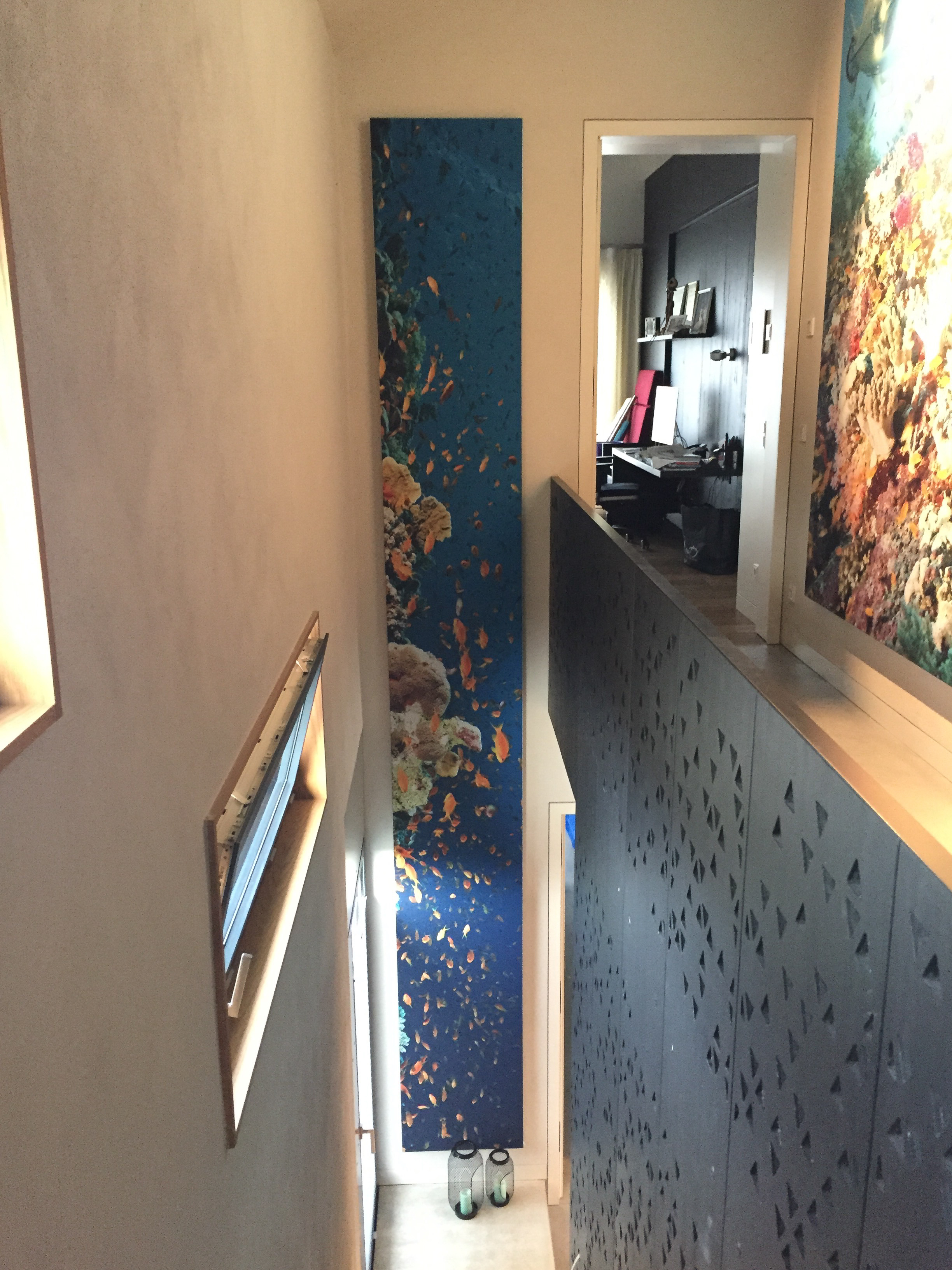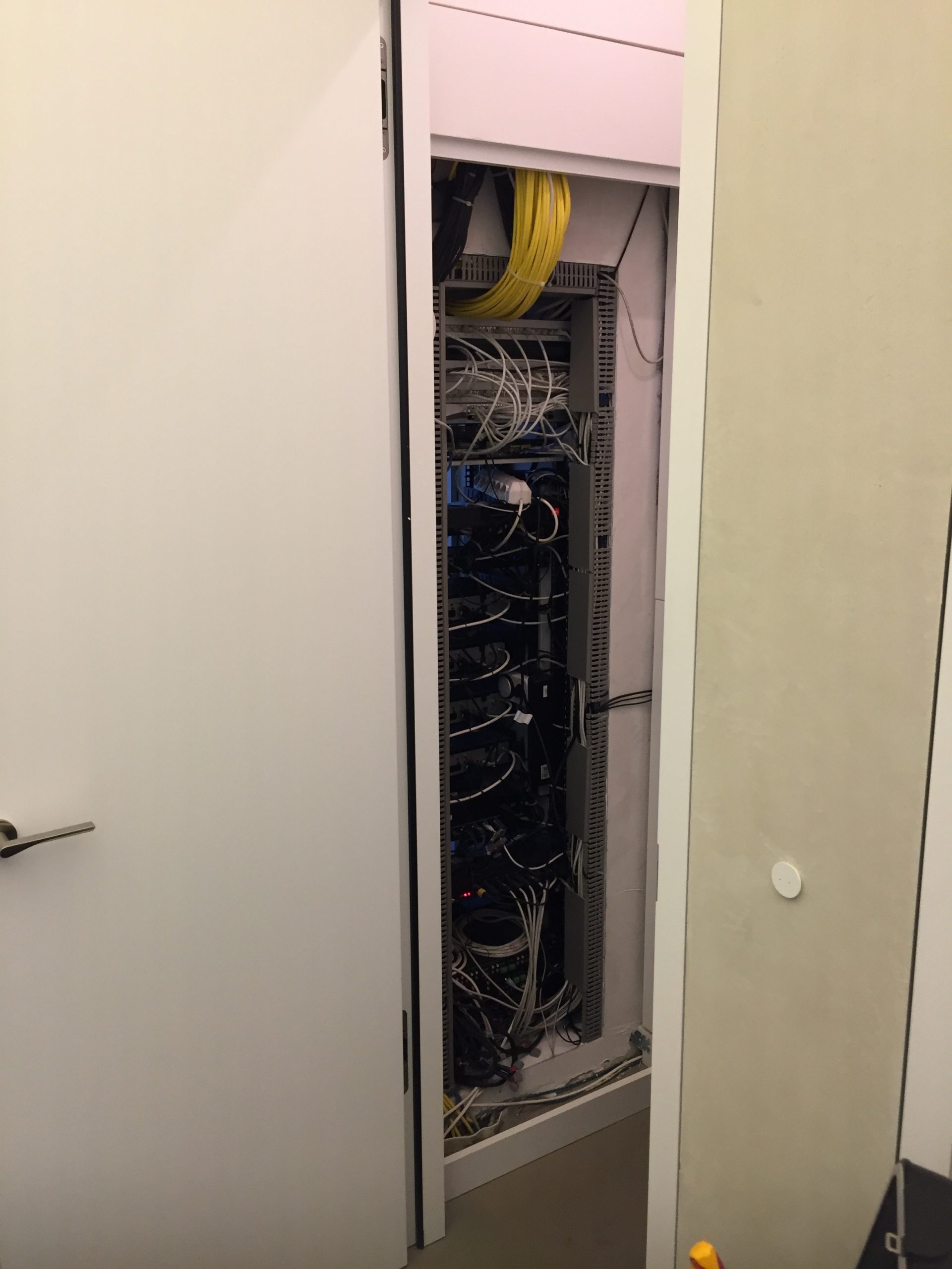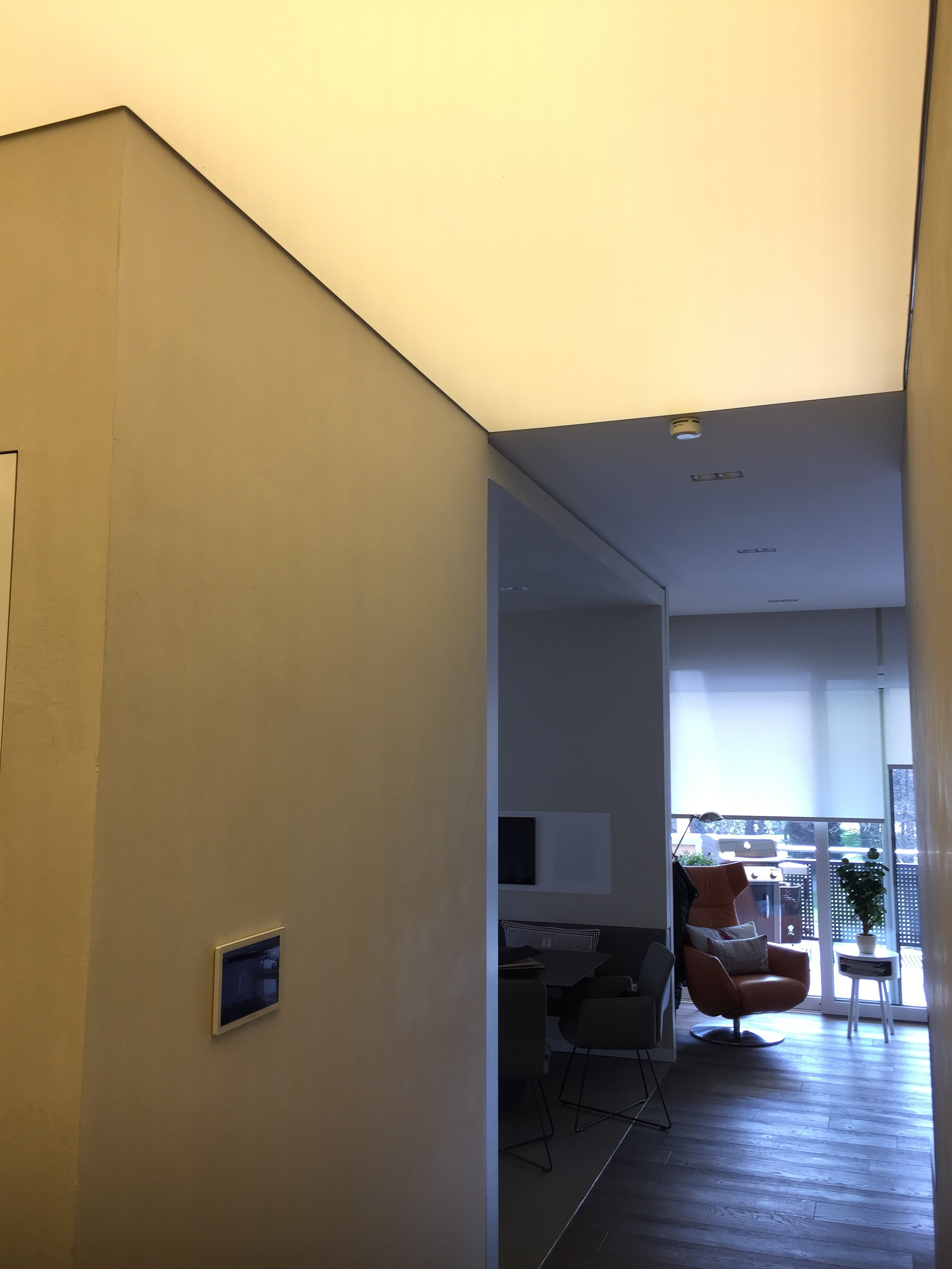 Nicht den üblichen Kram aus dem Elektromarkt, sondern professionelle Smart-Home-Technik von Crestron haben wir in diesem Penthouse verbaut. Musik in jedem Raum bis hin zur Sauna? Check! Home Cinema System? Check? Mehrere Fernseher? Logisch! Aber kommen wir mal weg von dem, was bei „Smart Home“ gedanklich naheliegt, hin zu den ungewöhnlicheren Dingen. So haben wir unseren Kunden zum Beispiel von Anfang an akustisch beraten, um den typischen Raumhall moderner Architektur aufzufangen. Das Ergebnis sind beispielsweise mehrere Lichtdecken mit mikroperforierten Membranen, die den Schall schlucken. Dahinter sitzen warmweiße und kaltweiße LEDs, die die Räume zu unterschiedlichen Tageszeiten in das passende Licht tauchen. Auch schallabsorbierende Bilder haben wir gebaut und geliefert, genauso wie jede Menge versteckt platzierte Absorber. Lautsprecher wurden ohne klangliche Nachteile unsichtbar in den Decken montiert. Bedeckt von dünnem Malervlies entfalten sie hier trotzdem ihren guten Klang. Gesteuert wird die ganze Technik bequem vom iPad aus – oder von den fest montierten Touchpanels.