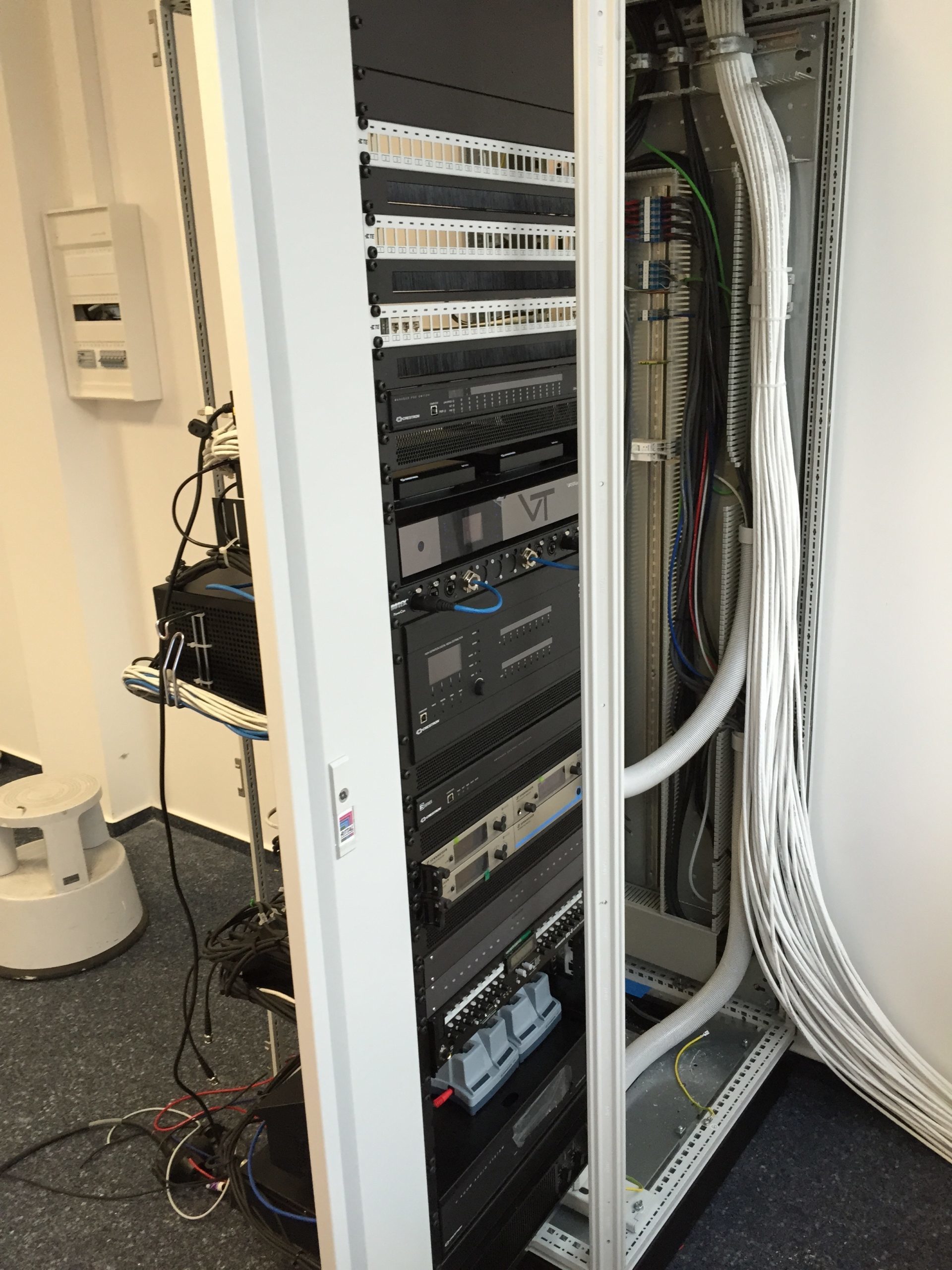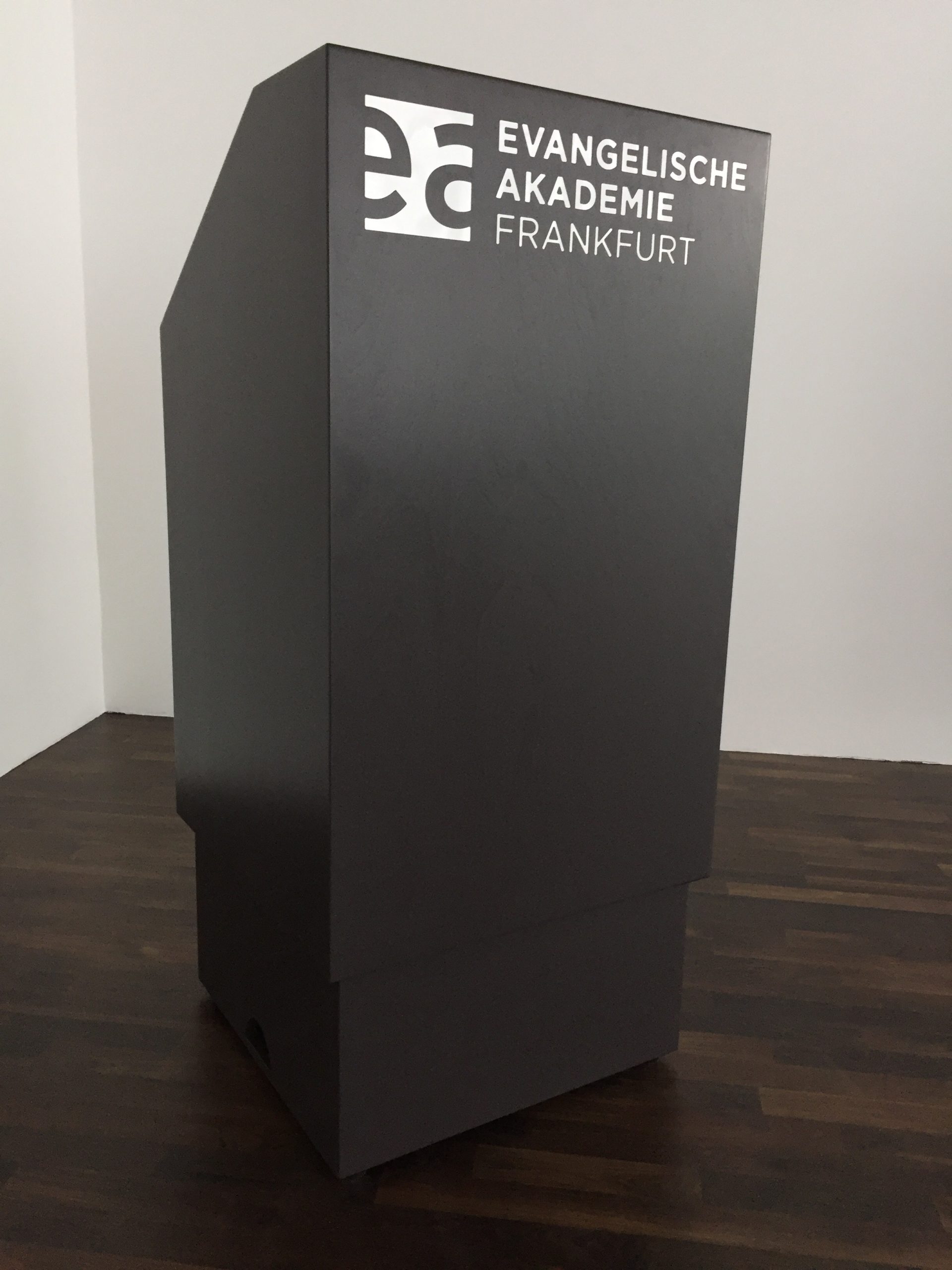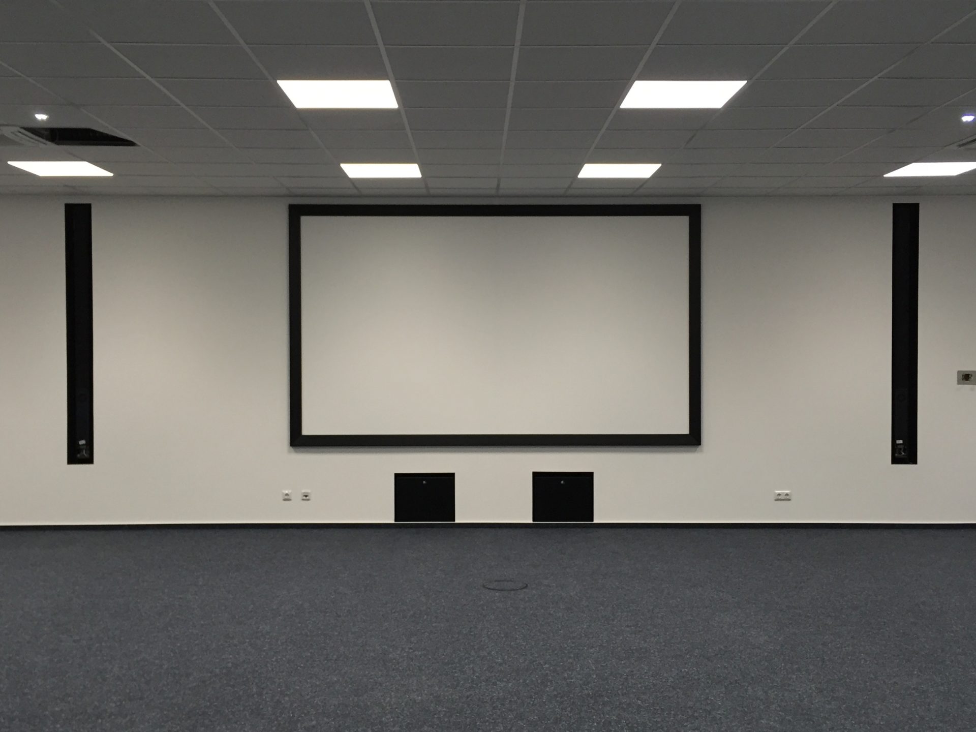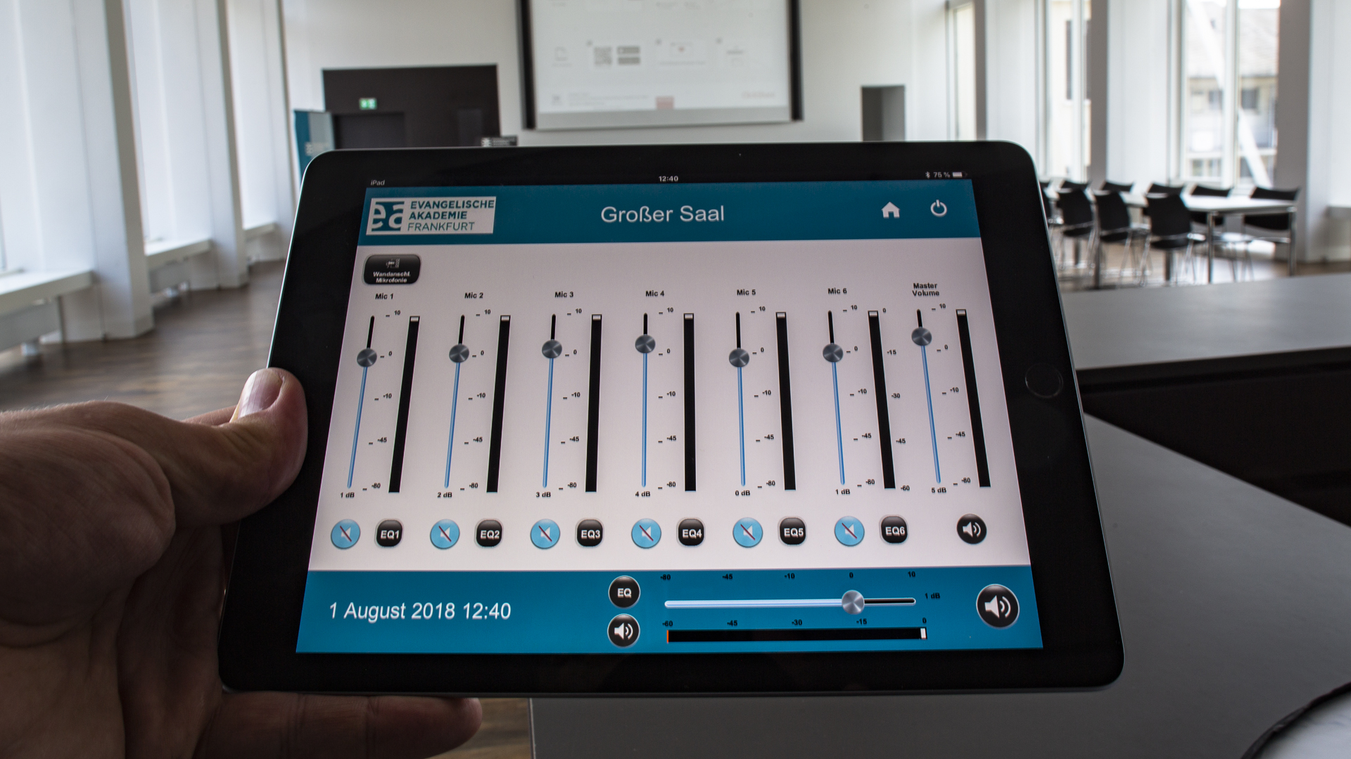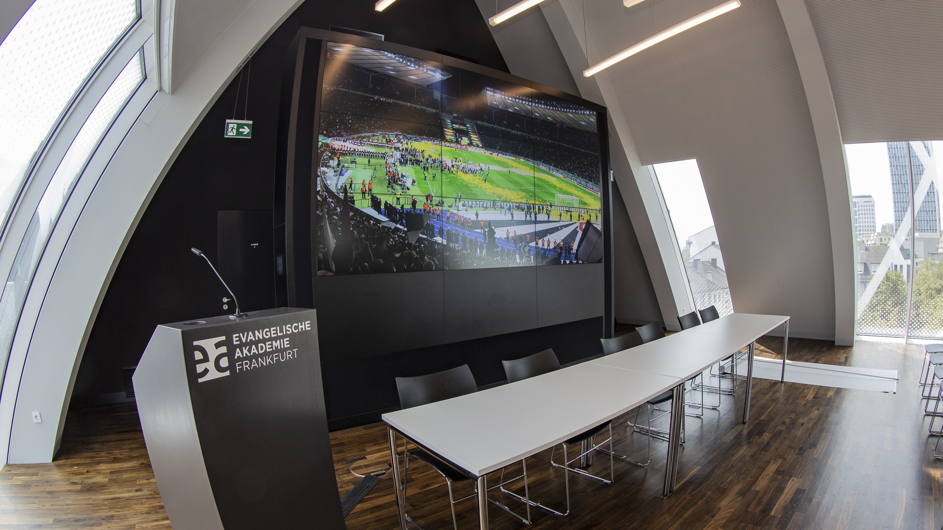 Zum Umbau der Evangelischen Akademie Frankfurt haben wir die komplette Medientechnik geplant, geliefert und montiert, programmiert. Zu den Besonderheiten zählt der Sonderbau einer freistehenden Split-Wand mit integriertem Beam-Steering-Beschallungssystem. Nicht nur dass wir auf Details wie eine Standsicherheitsüberprüfung geachtet haben, unser Kunde kann die Beschallung sehr leicht an unterschiedliche Besucherzahlen und Bestuhlungsformen anpassen. Im Großen Saal haben wir eine 5 Meter große Leinwand schon in der Rohbauphase per Baukran eingebracht. Wir haben elektrisch höhenverstellbare Rednerpulte geliefert und sie mit individuellen CNC-Fräsungen versehen. Zur Unterbringung des Beamers haben wir eine Projektionskabine gebaut. Und schließlich lässt sich die Medientechnik bequem vom iPad aus steuern.