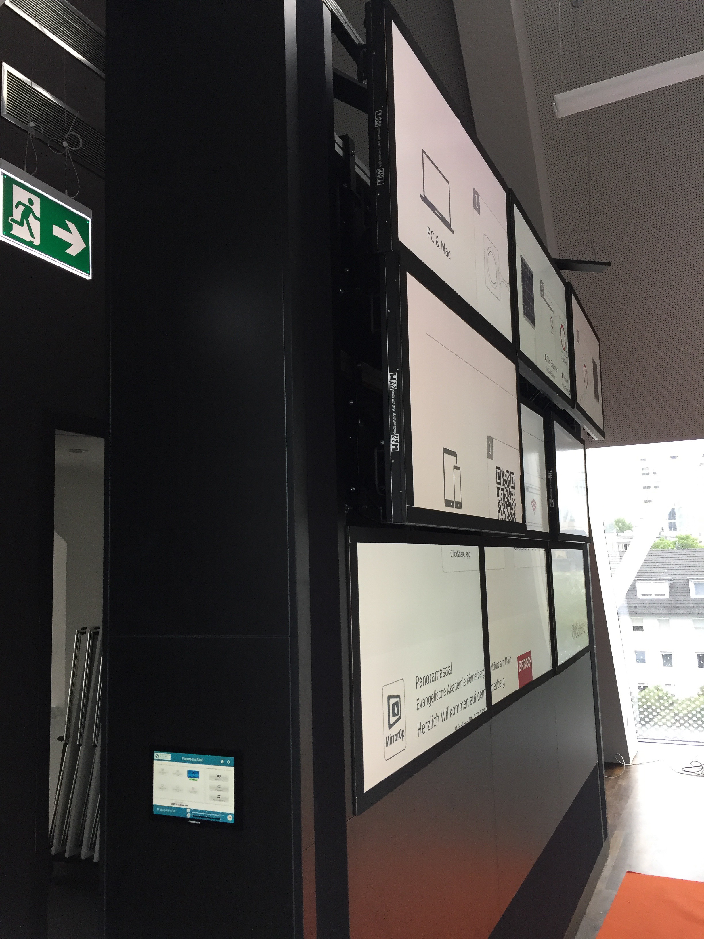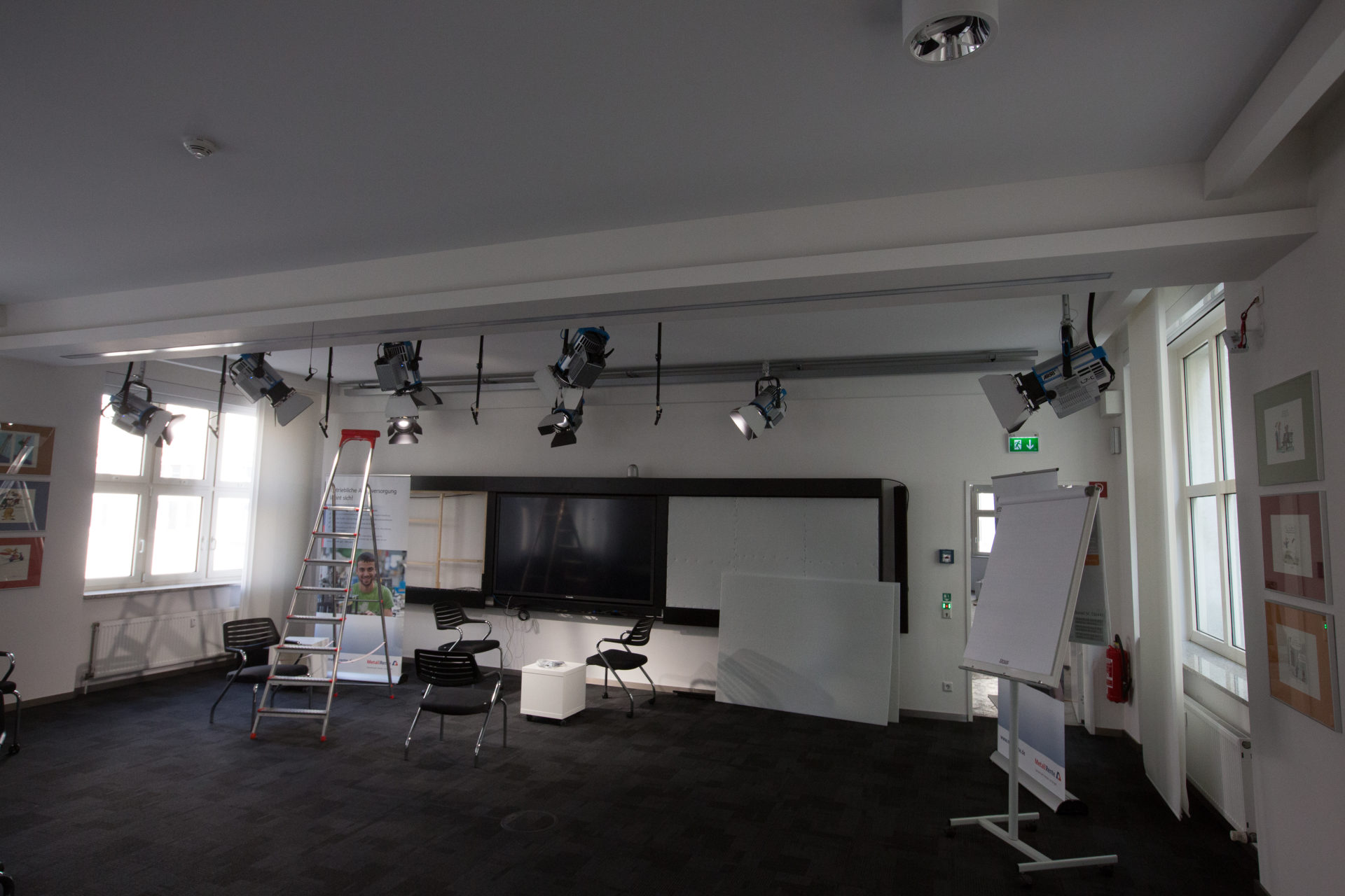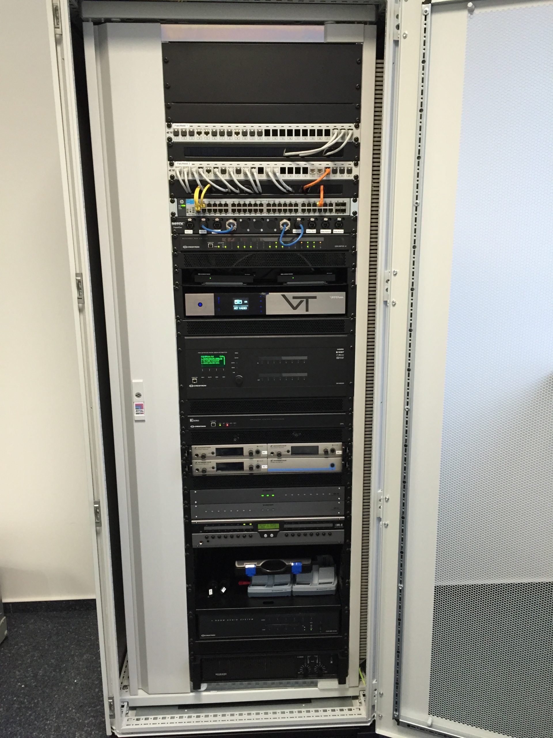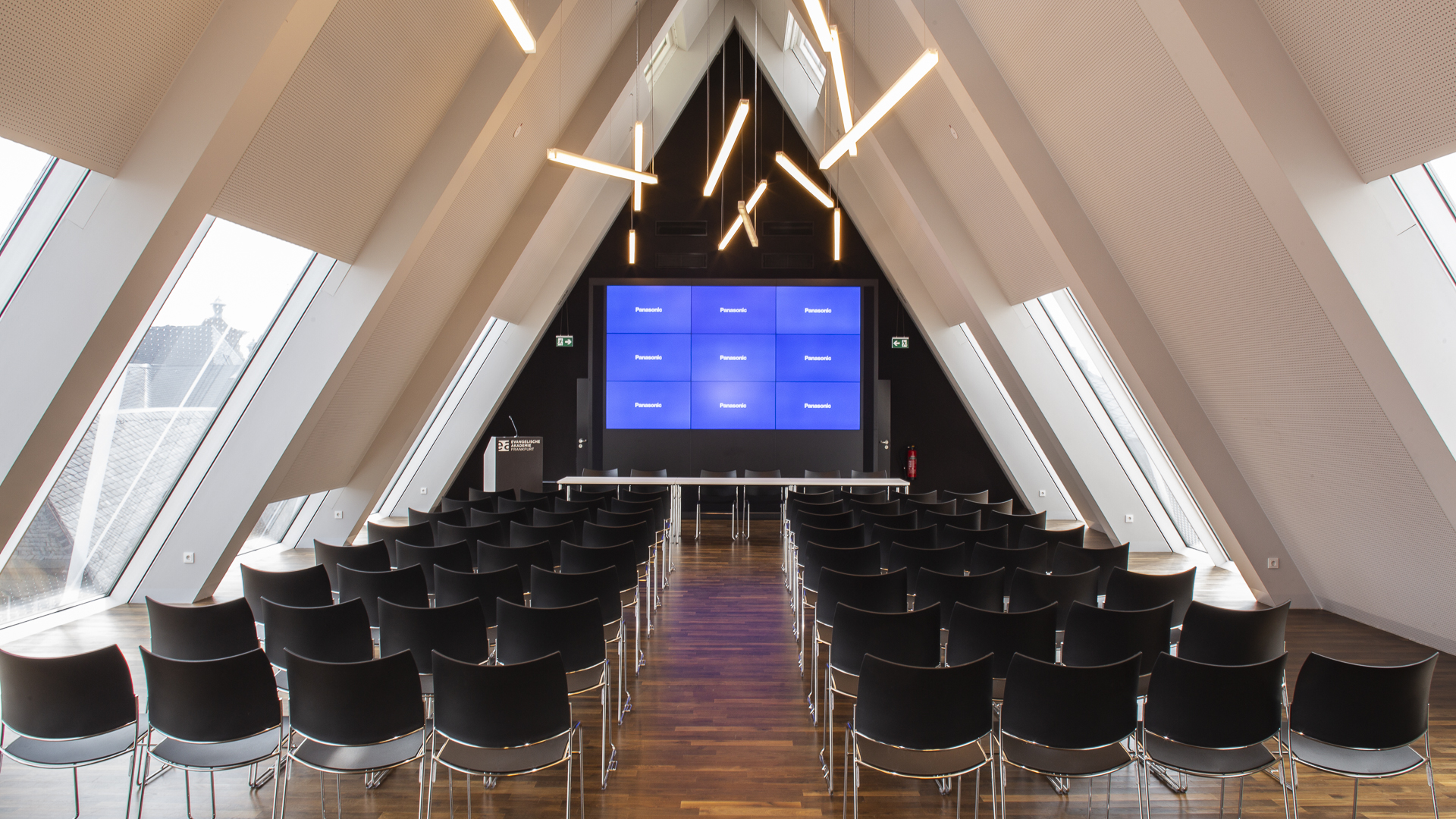 Zum Umbau der Evangelischen Akademie Frankfurt haben wir die komplette Medientechnik geplant, geliefert und montiert, programmiert. Zu den Besonderheiten zählt der Sonderbau einer freistehenden Split-Wand mit integriertem Beam-Steering-Beschallungssystem. Nicht nur dass wir auf Details wie eine Standsicherheitsüberprüfung geachtet haben, unser Kunde kann die Beschallung sehr leicht an unterschiedliche Besucherzahlen und Bestuhlungsformen anpassen. Im Großen Saal haben wir eine 5 Meter große Leinwand schon in der Rohbauphase per Baukran eingebracht. Wir haben elektrisch höhenverstellbare Rednerpulte geliefert und sie mit individuellen CNC-Fräsungen versehen. Zur Unterbringung des Beamers haben wir eine Projektionskabine gebaut. Und schließlich lässt sich die Medientechnik bequem vom iPad aus steuern.