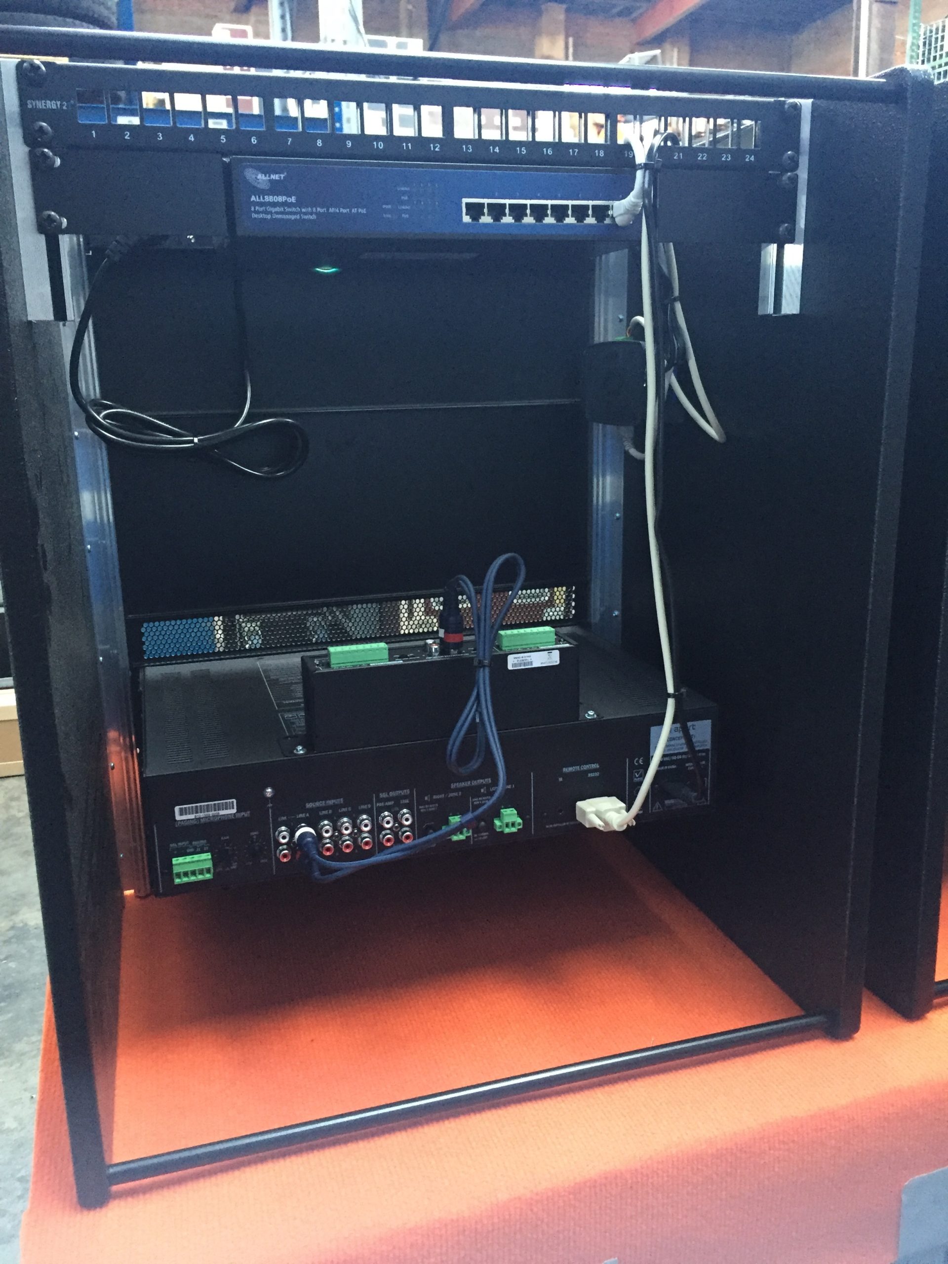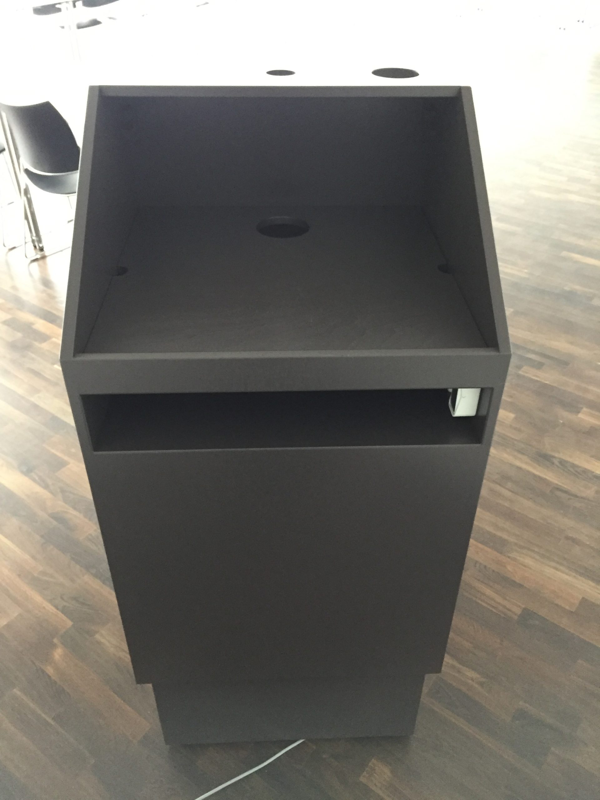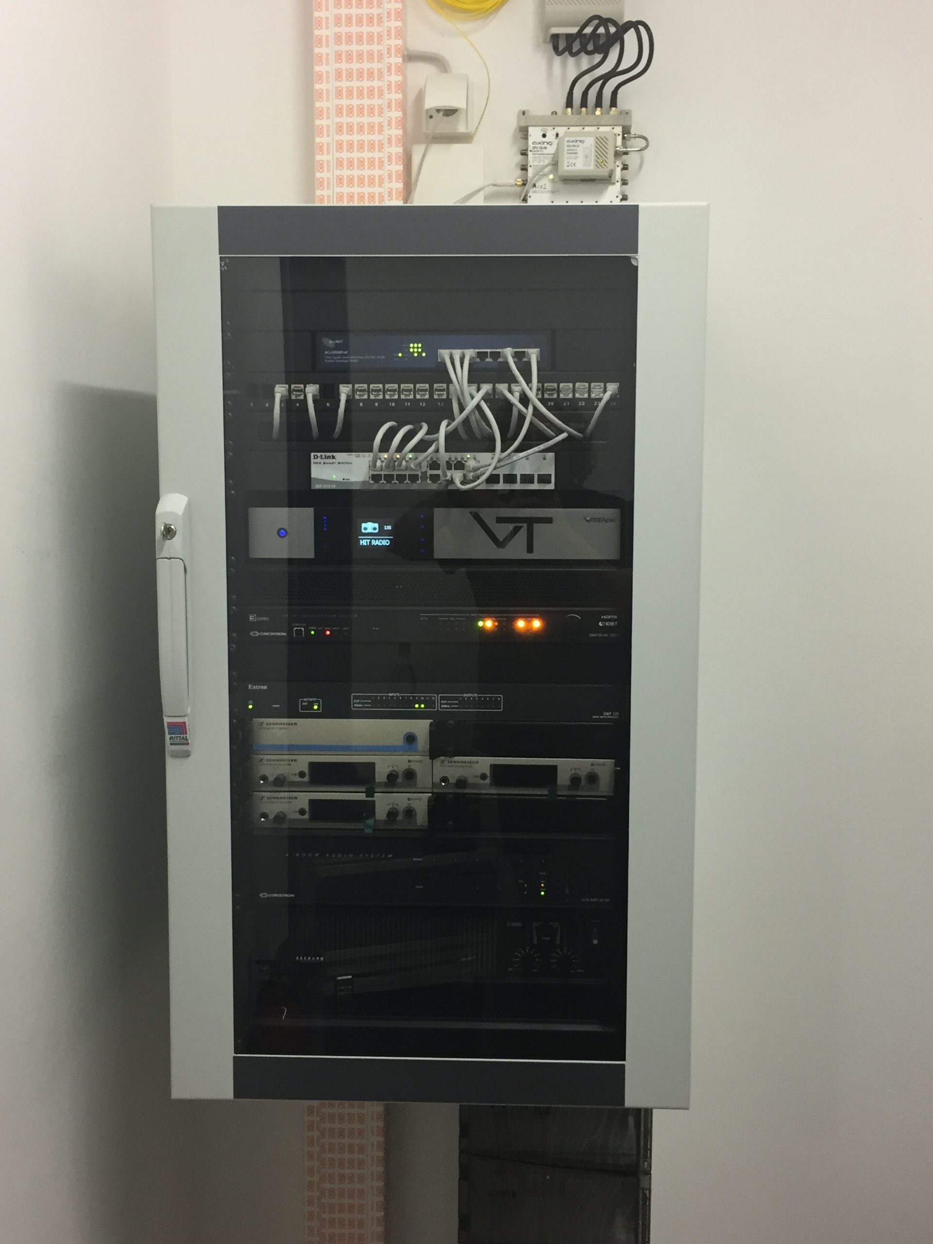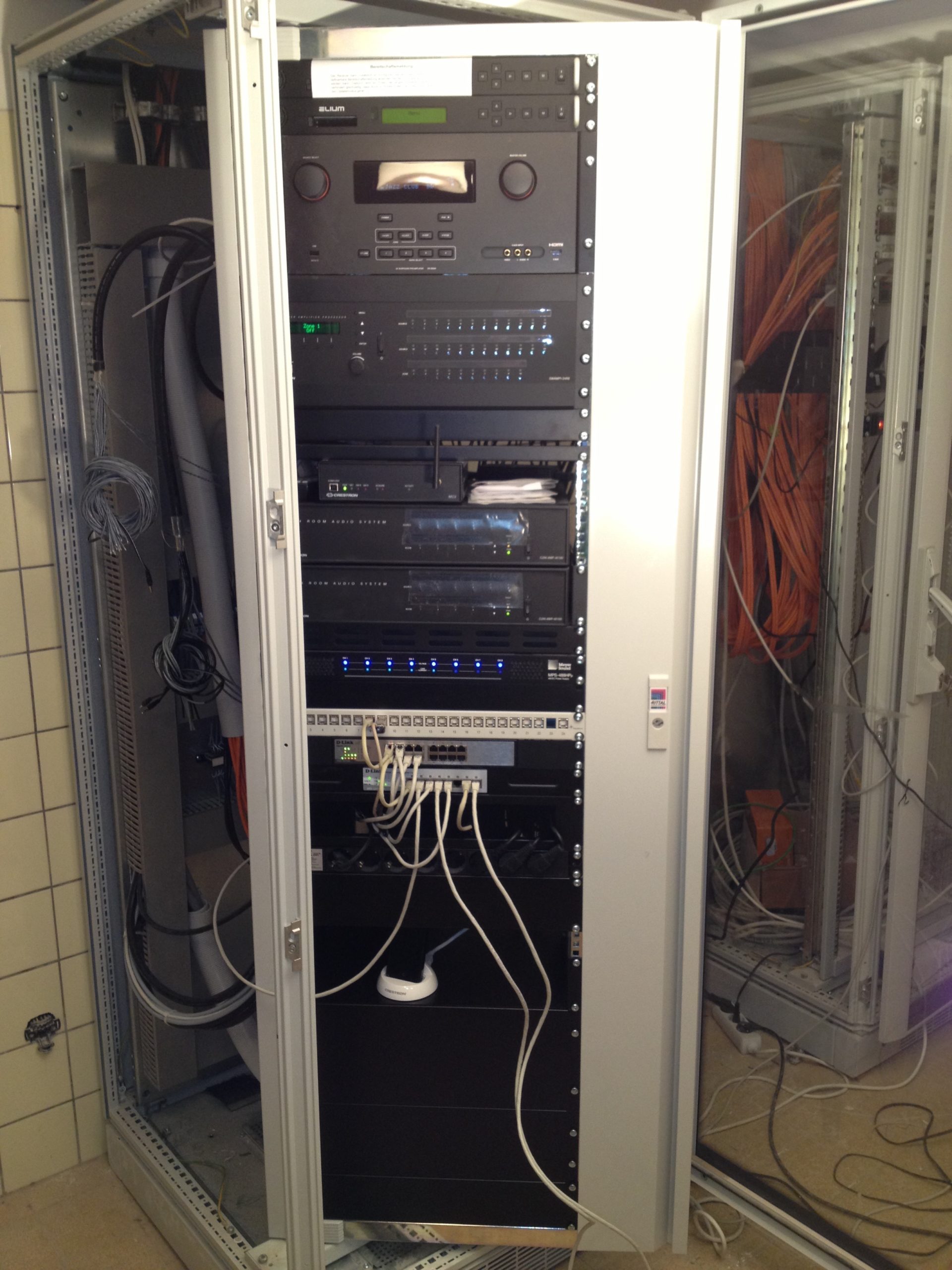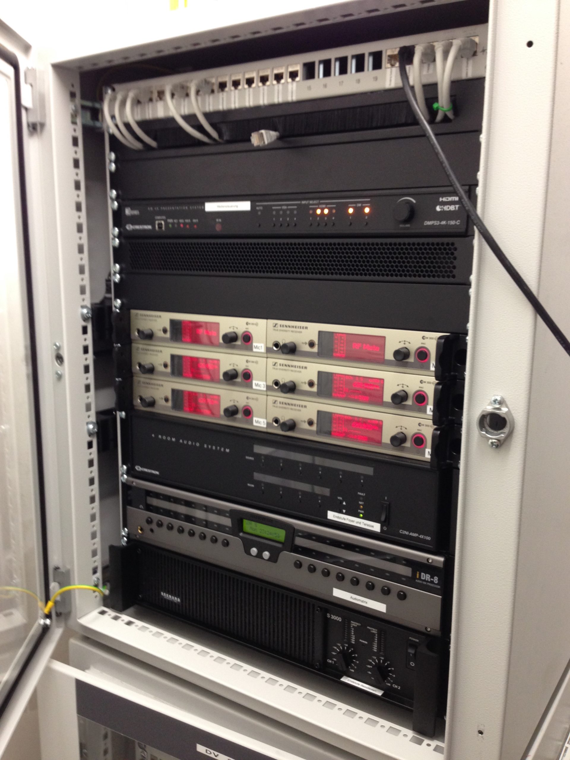 Zum Umbau der Evangelischen Akademie Frankfurt haben wir die komplette Medientechnik geplant, geliefert und montiert, programmiert. Zu den Besonderheiten zählt der Sonderbau einer freistehenden Split-Wand mit integriertem Beam-Steering-Beschallungssystem. Nicht nur dass wir auf Details wie eine Standsicherheitsüberprüfung geachtet haben, unser Kunde kann die Beschallung sehr leicht an unterschiedliche Besucherzahlen und Bestuhlungsformen anpassen. Im Großen Saal haben wir eine 5 Meter große Leinwand schon in der Rohbauphase per Baukran eingebracht. Wir haben elektrisch höhenverstellbare Rednerpulte geliefert und sie mit individuellen CNC-Fräsungen versehen. Zur Unterbringung des Beamers haben wir eine Projektionskabine gebaut. Und schließlich lässt sich die Medientechnik bequem vom iPad aus steuern.